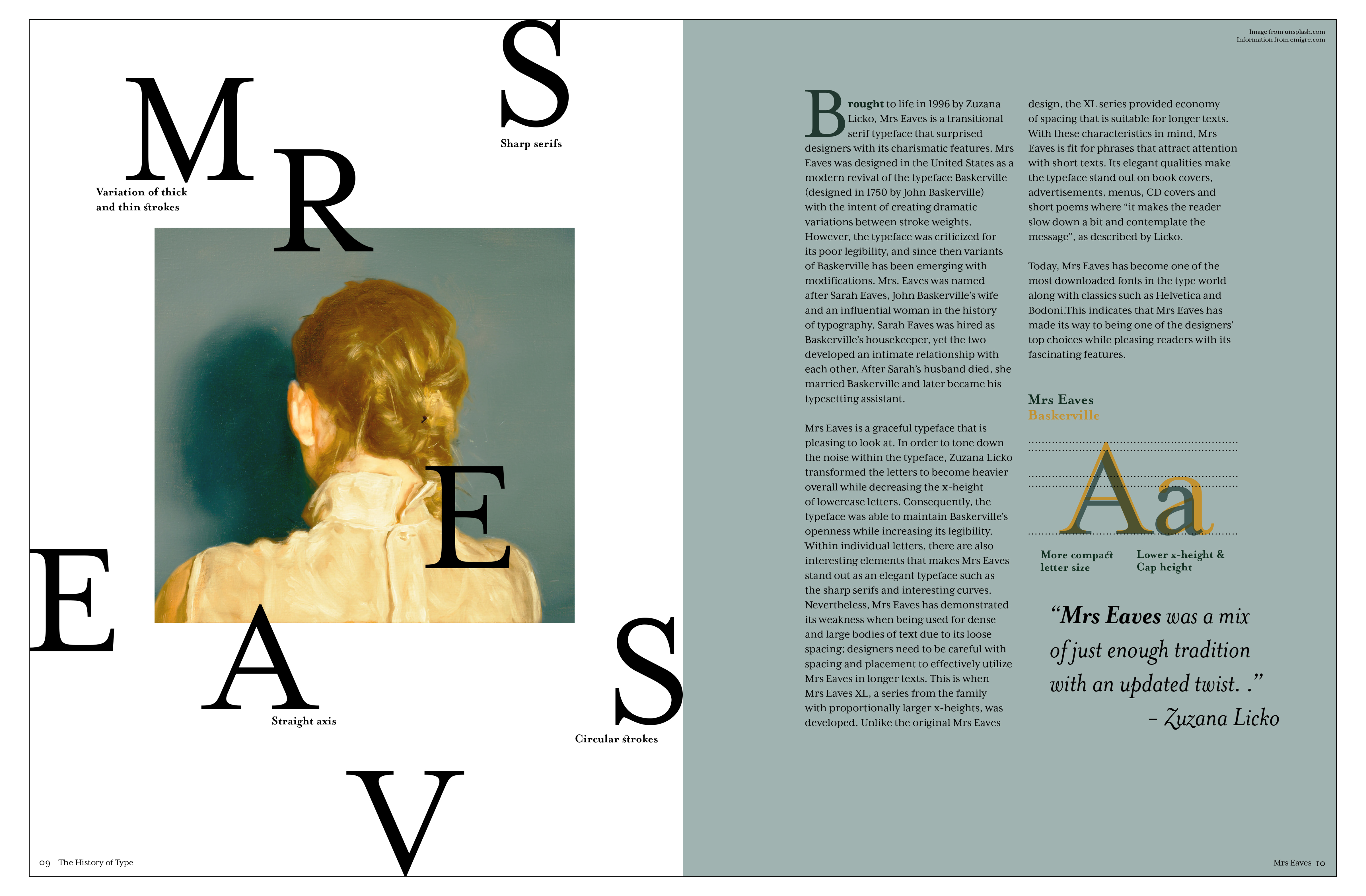 to create a two-page spread(16” x 10.5”) and a video(1 minuet) that introduces the reader to the typeface - Mrs Eaves